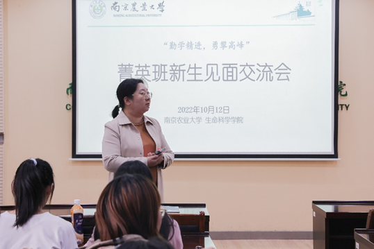 第一部分班主任刘园园老师致词。刘老师首先给大家解读了什么是“菁英班”、“菁英班”前八届的历史、同学们在进入菁英班后要做些什么以及注意事项等。 南京农业大学生命科学学院在菁英班的培养与管理上已积累了丰富的理论和实践经验。已毕业的学员也以出色的科研思维和创新意识得到了国内外高校及研究所较高的评价。此外,刘园园还向同学们介绍了全国大学生生命科学竞赛等科研项目。