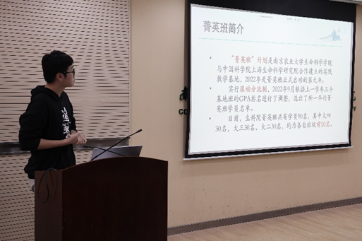 第二部分由新一届菁英班班长李振宇为大家介绍菁英班,并总结了菁英班过去一年的工作,如中国科学院上海生命科学研究院专家系列学术报告、南京诺维赞生物技术有限公司实习等,最后介绍了几位优秀毕业生,鼓励大家积极向他们学习。