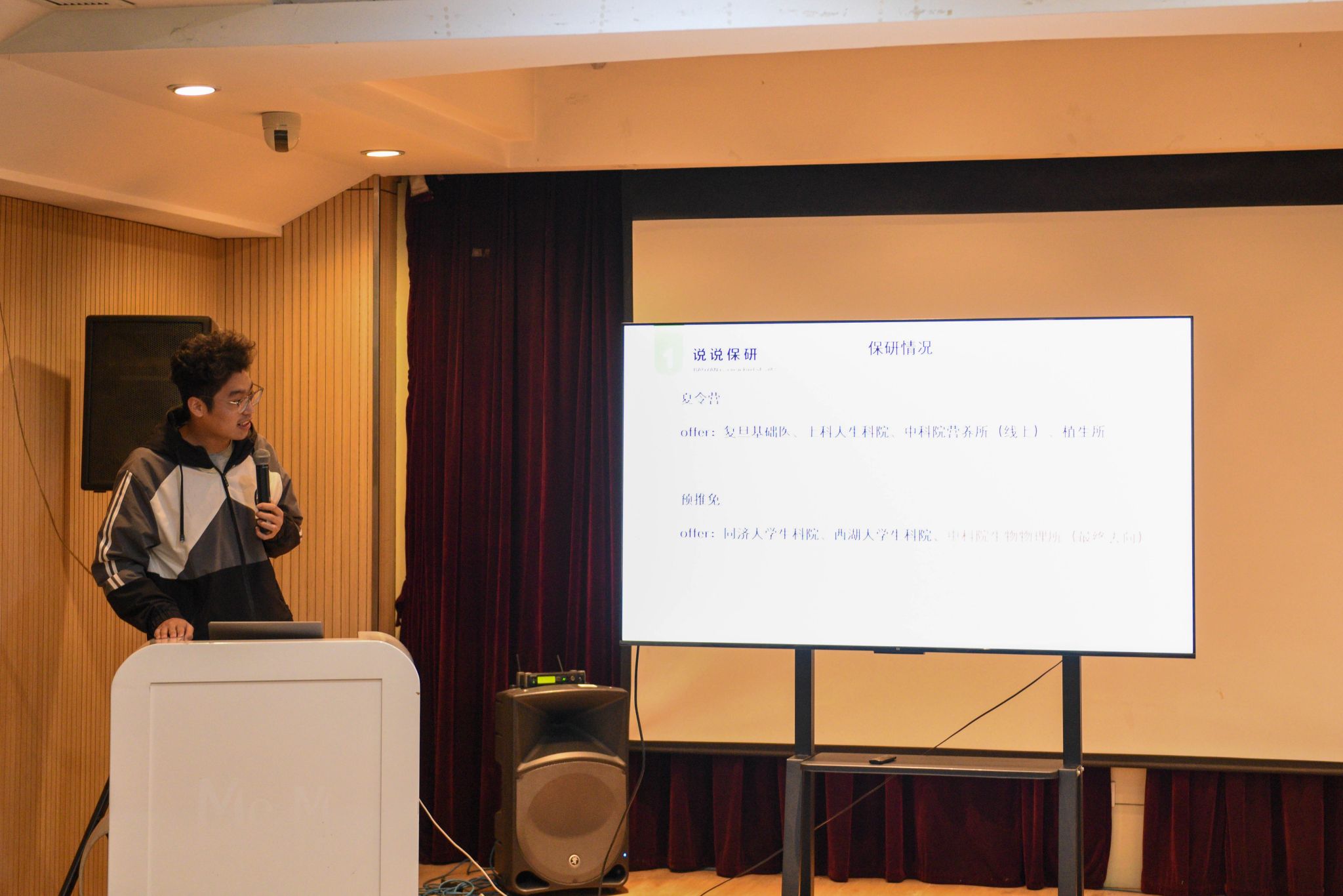 第二位主讲人、已保送至北京大学的大四学生芸真秧宗,介绍了参加夏令营的内容。芸真秧宗建议,夏令营与期末考试周可能会有冲突,建议学生合理安排,避免时间冲突。