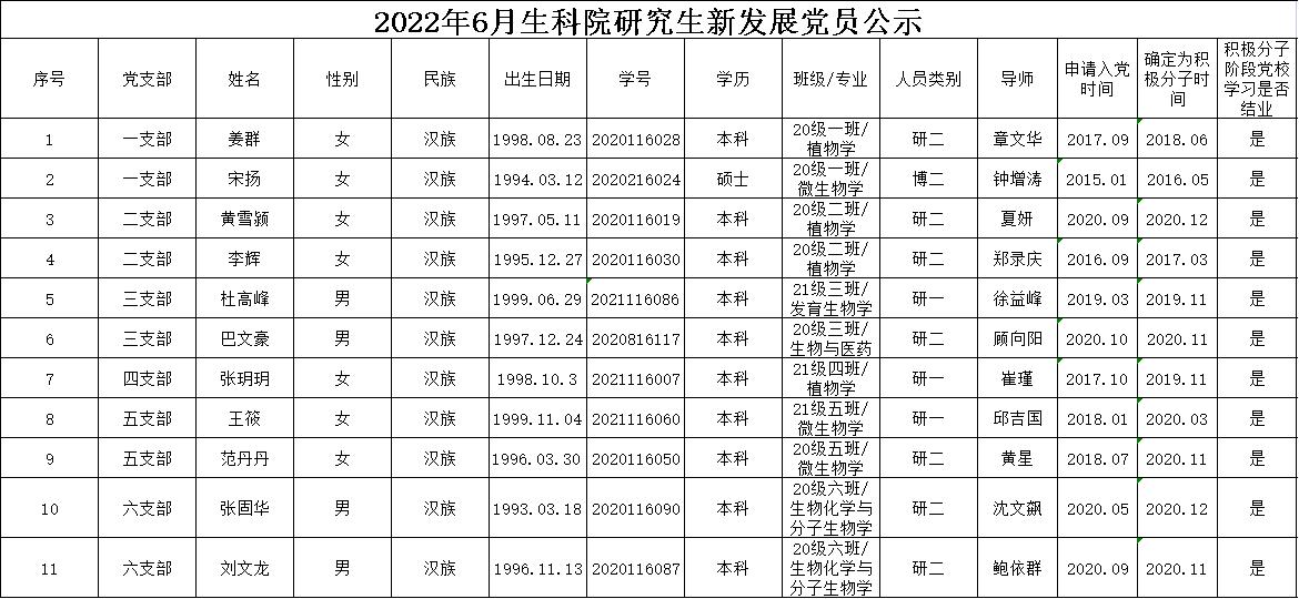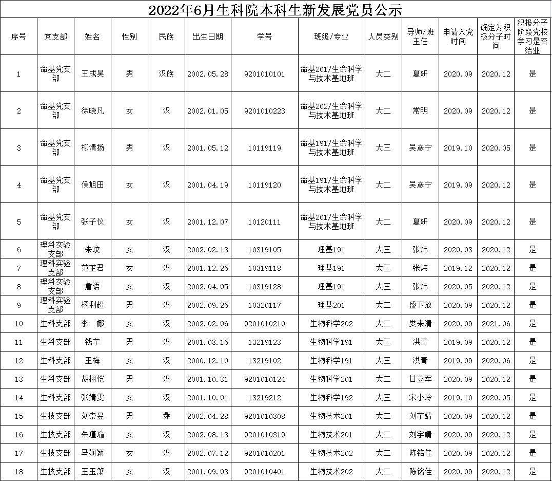 根据生命科学学院学生党员发展工作安排,经由各团支部推选,党支部讨论,结合个人成绩、综合测评以及获奖任职等综合表现,经院党委组织答辩、讨论审核,2022年6月拟发展预备党员29名,具体名单如下。 如有任何疑问,请在2022年6月8日前向学院团委、学院党委或校党委组织部反映。 联系电话:学院团委电话:84396673 学院党委电话:84395563