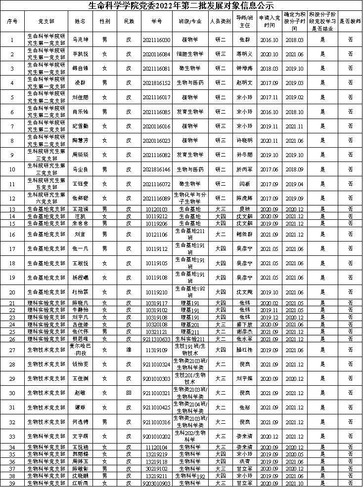 现将本批发展对象名单及档案材料预审结果公示如下,公示时间为2022年11月25日至12月1日。公示期内积极接受广大师生监督,如对发展对象的政治表现、入党材料、发展程序、先进性等各方面存在异议,请反馈至生命科学学院党委。