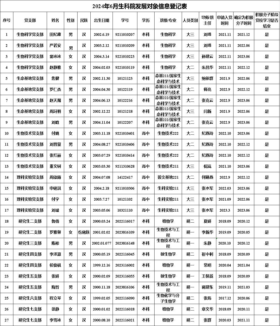 现将本批发展对象名单及档案材料预审结果公示如下,公示时间为2024年6月3日至6月7日。公示期内积极接受广大师生监督,如对发展对象的政治表现、入党材料、发展程序、先进性等各方面存在异议,请反馈至生命科学学院党委。