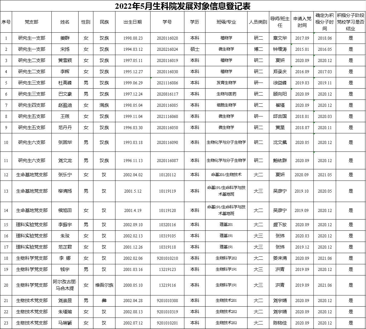 现将本批发展对象名单及档案材料预审结果公示如下,公示时间为2022年5月18日至5月24日。公示期内积极接受广大师生监督,如对发展对象的政治表现、入党材料、发展程序、先进性等各方面存在异议,请反馈至生命科学学院党委。