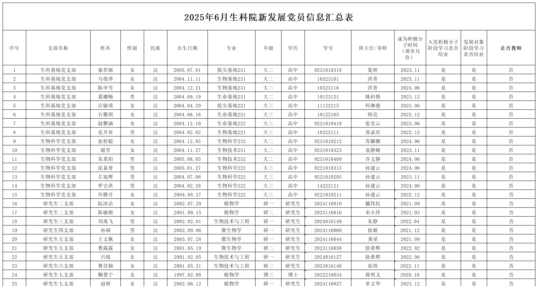 根据生命科学学院学生党员发展工作安排,经由党支部讨论,结合个人成绩、综合测评以及获奖任职等综合表现,经院党委组织答辩、讨论审核,2025年6月拟发展预备党员25名,具体名单如下。