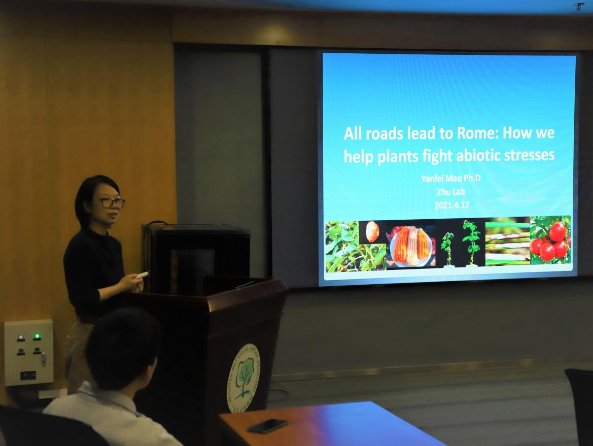 毛妍斐副研究员进行了题为《条条大路通罗马:我们如何帮助植物抗击非生物胁迫》的报告,从遗传学、表观遗传学和基因编辑三个方面介绍了帮助植物应对干旱胁迫的调节机制。在问答环节,崔瑾教授与毛妍斐研究员交流了对学生的培养问题。