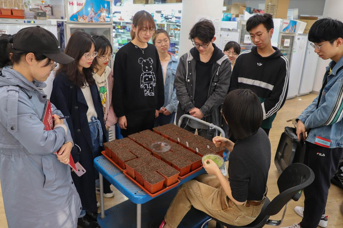 报告结束后,南农生科院毕业生、“未来生物学家计划”学员朱彧带领新学员们参观逆境中心。通过他的讲解,学员们初步了解了逆境中心的设施布局、研究环境和学习工作内容。在参观实验室时,学员们偶遇了正在移栽拟南芥幼苗的毛妍斐老师。她与学员们进行了亲切友好的交谈,并分享了开展植物实验时的一些经验。