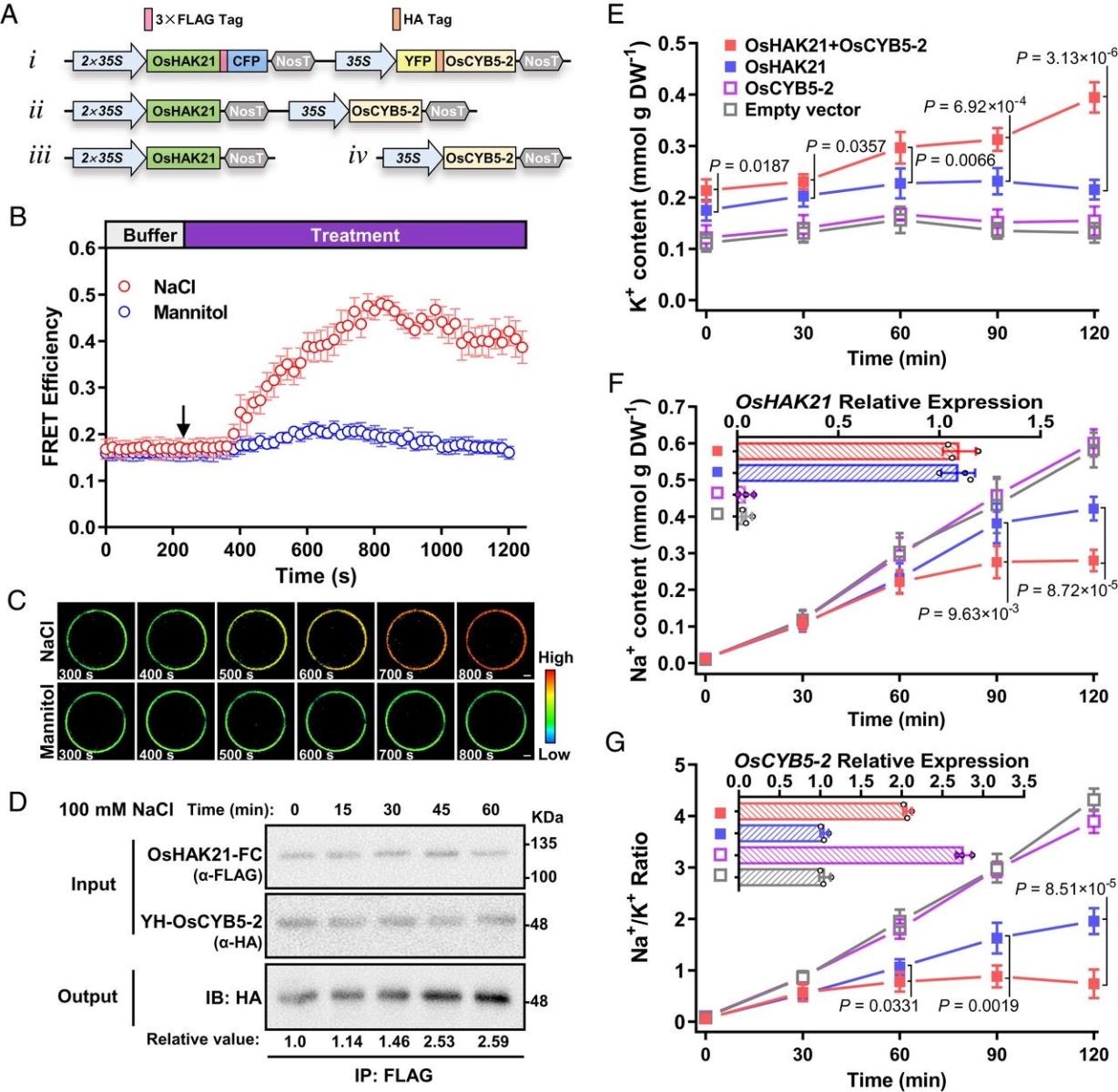 为了揭示水稻在盐胁迫下维持细胞内K+稳态和K+/Na+的调控机制,该团队在前期工作中鉴定了K+转运蛋白的编码基因OsHAK21调控水稻耐盐性(Shen 等, 2015)。在此基础上,他们筛选到OsHAK21互作蛋白,细胞色素b5(OsCYB5-2);它定位在内质网膜。通过在酵母和植物(拟南芥和水稻)中转基因证明OsCYB5-2通过OsHAK21加强对细胞内K+稳态和耐盐性的调控作用。