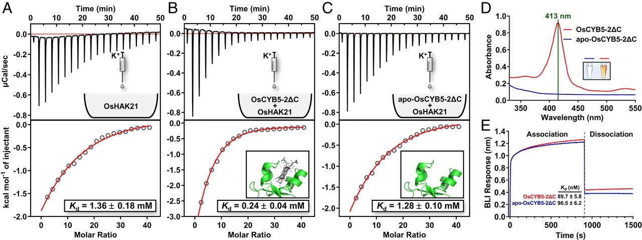他们的研究还发现,高盐诱导OsHAK21-OsCYB5-2互作增强(图1)。OsCYB5-2结合OsHAK21不仅增强了OsHAK21对K+的亲和力,也减轻了高盐环境中Na+对OsHAK21转运活性的抑制,稳定OsHAK21介导的K+吸收,限制Na+进入细胞,从而维持了水稻细胞内K+/Na+平衡。OsCYB5-2的调节功能依赖其自身结合heme(血红素)(图2)。
