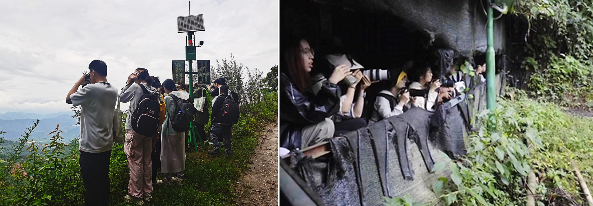 样点调查选在了1700米海拔处的鸟塘。在美食的吸引下,各种鸟儿争相登场,在大家眼前上演了进食、打斗、嬉戏、沐浴的大戏。大家爽看、爽拍,对某些鸟类的形态特征和行为习惯有了更多的了解。在野外经常只闻其声、不见其影的几种鸟,红赤薮鹛、赤尾噪鹛、栗额斑翅鹛等,给了大家充分观赏的时间。同学们认真地记录着每种鸟出现的时间和频次。
