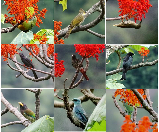 7月的百花岭,火桐树上的红色花朵鲜艳靓丽,吸引着虫儿鸟儿们的注意,是它们的食物来源之一,同时它们也为火桐的传粉贡献力量。一天的时间,师生们观察记录了二十多种访问火桐的鸟儿。有的是食花的,比如黑短脚鹎、纹背捕蛛鸟、橙腹叶鹎、朱鹂、黑头奇鹛、长尾奇鹛,大拟啄木鸟;有的是在树上休憩的,比如铜蓝鹟,纵纹绿鹎,黄颊山雀,蓝喉拟啄木鸟,大拟啄木鸟等;还有捕食树上的昆虫的,比如红耳鹎。 同学们对此进行了详细的记录和分析。