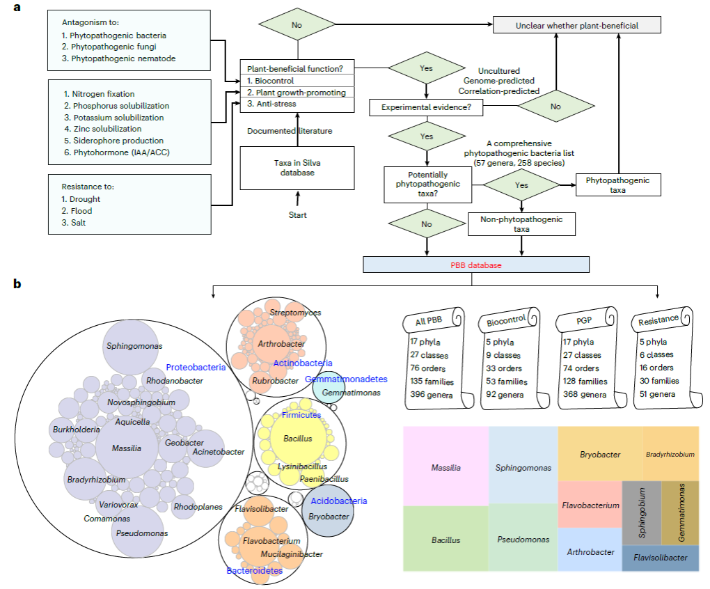 一直以来,化肥和化学农药在农业生产中的过量施用为生态环境和人类健康带来重大威胁。充分挖掘和利用微生物的有益性状,进而降低化肥、农药的施用,或可为农业可持续发展带来新的机遇。研究团队基于微生物的三大类植物有益性状(生防、促生、抗逆),开发了首个全球最大的植物有益细菌数据库(包含来自135个科的396个细菌属,同时也建立了包含来自57个属258个种的植物病原细菌清单),并利用地球微生物组计划(EMP)释放的测序数据对植物有益细菌的全球地理分布和未来变化进行了探究。研究表明,植物有益细菌的多样性在低维度地区最高,存在明显的纬度多样性梯度。植物有益细菌的全球分布主要受环境过滤控制,而气候是最重要的影响因素。预测模型显示,到本世纪末,土壤中植物有益细菌的相对丰度将出现明显下降,尤其是生防细菌(-1.03%)和抗逆细菌(-0.61%)的相对丰度下降尤为显著。该研究构建的本地化的植物有益微生物数据库可为植物微生物组的高效、精准合成提供理论指导和技术支撑。