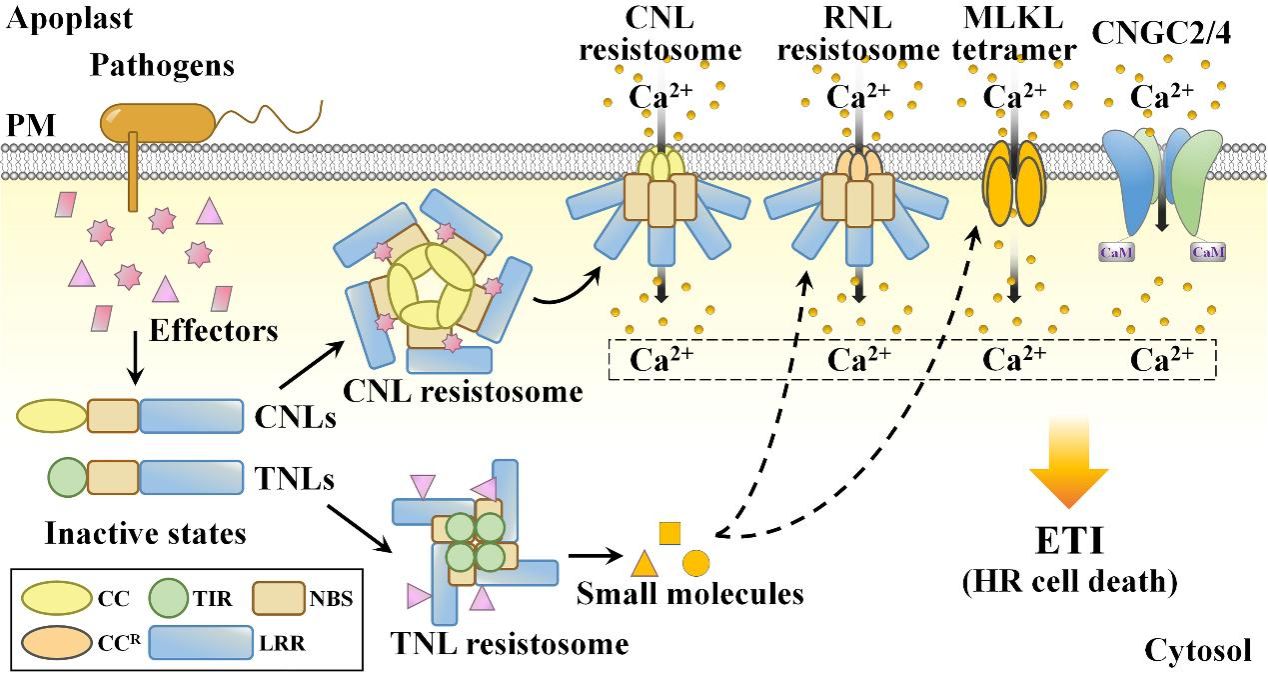 植物先天免疫系统具有两种主要的免疫机制:模式诱导免疫(pattern-triggered immunity,PTI)和效应子诱导免疫(effector-triggered immunity,ETI)。PTI和ETI展现出部分重叠的免疫反应,比如细胞内Ca2+内流、活性氧爆发、丝裂原活化蛋白激酶激活、转录重编程和植物防御相关激素的产生。有研究表明二者可以形成相互增强的免疫反应回路。