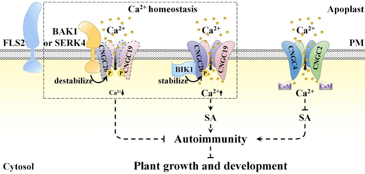 钙离子(Ca2+)作为第二信使在植物生命活动中扮演着重要角色,其在植物免疫中的确切作用一直是科学界的焦点。近日,南京农业大学常明课题组和河南农业大学王燃课题组合作在New Crops在线发表综述论文“Lighting-up Wars: Stories of Ca2+ Signaling in Plant Immunity”。文章系统总结了Ca2+通道及Ca2+传感器在植物免疫信号转导中的重要作用,并重点讨论了Ca2+通道的活性调控机制以及Ca2+信号引发超敏反应细胞死亡的可能机制。