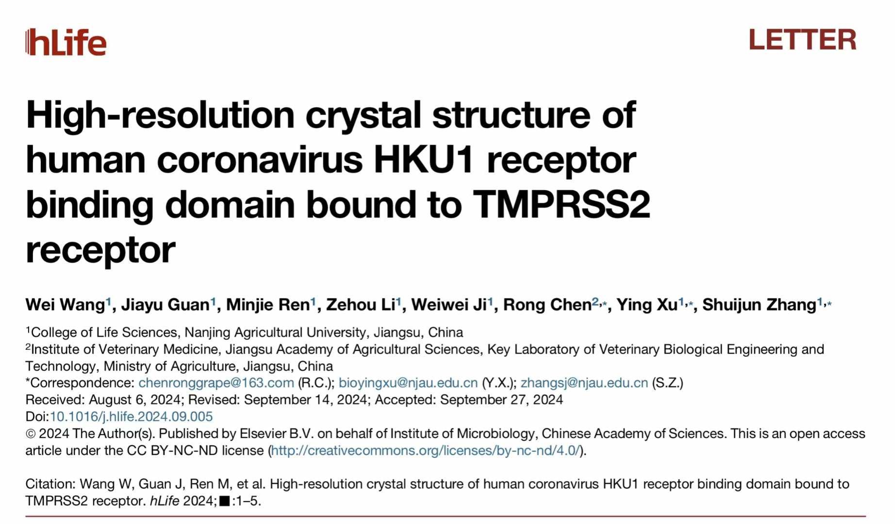 2024年10月1日,我校生命科学学院张水军教授课题组在《hLife》杂志发表了题为《High-resolution crystal structure of human coronavirus HKU1 receptor binding domain bound to TMPRSS2 receptor》(人冠状病毒HKU1受体结合域与TMPRSS2受体结合的高分辨率晶体结构)的研究论文,报道了人冠状病毒HKU1受体识别机制方面的研究成果。