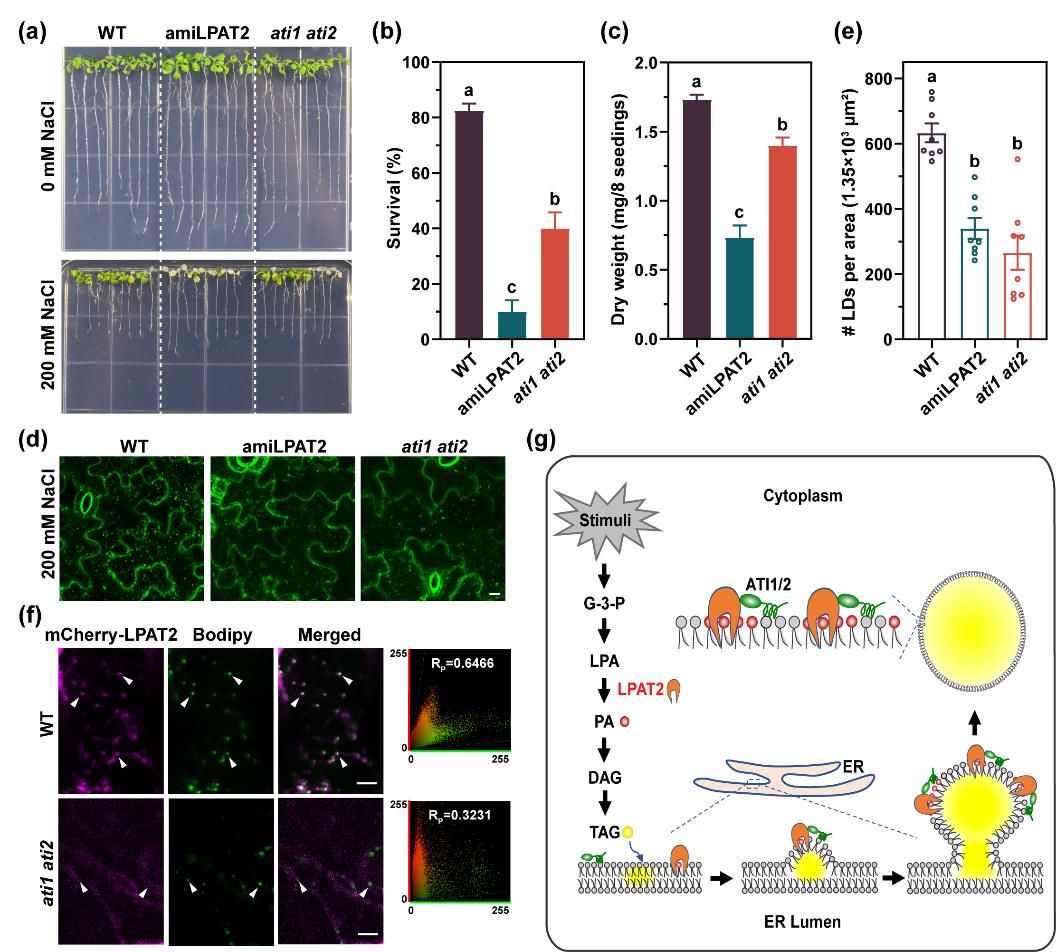 近日,南京农业大学生命科学学院张群教授课题组在国际权威学术期刊《New Phytologist》发表题为“The endoplasmic reticulum-localized acyltransferase LPAT2 interacts with ATI1/2 and mediates lipid droplet proliferation”的研究论文。该研究首次揭示溶血磷脂酸酰基转移酶 LPAT2及其催化产物磷脂酸(PA)在脂滴增殖与植物耐盐中的关键作用,为解析脂滴动态调控网络提供了全新视角。