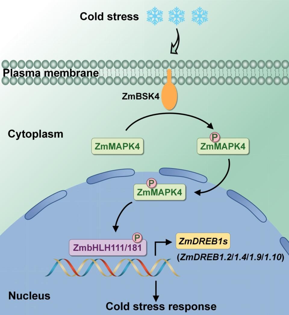 该研究鉴定到油菜素甾醇信号激酶4(ZmBSK4)作为ZmMAPK4的上游激酶调控玉米耐冷性。功能分析表明,ZmMAPK4和ZmBSK4正调控玉米耐冷性。ZmBSK4直接与ZmMAPK4互作,并磷酸化ZmMAPK4的Ser-171位点。该位点的磷酸化可增强ZmMAPK4激酶活性并提升玉米耐冷性。接下来发现ZmMAPK4可以磷酸化两个底物:bHLH转录因子ZmbHLH111和ZmbHLH181,ZmMAPK4 Ser-171位点的磷酸化会增强ZmMAPK4对ZmbHLH111和ZmbHLH181的磷酸化作用,进而促进其转录活性。进一步发现,ZmbHLH111和ZmbHLH181诱导冷响应基因ZmDREB1.2/1.4/1.9/1.10的表达,从而增强玉米耐冷性。该研究揭示了一种MAPK增强玉米耐冷性的非经典调控机制,拓展了我们对冷胁迫下MAPK激活机制的理解,对利用分子生物学手段提高作物的耐逆性具有重要意义。