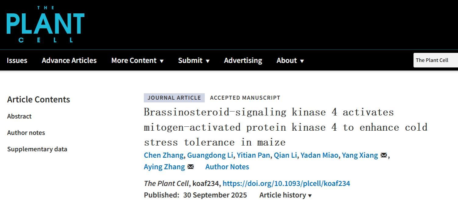 近日,南京农业大学生命科学学院、作物遗传与种质创新利用全国重点实验室张阿英教授团队在《Plant Cell》上发表了题为“Brassinosteroid-signaling kinase 4 activates mitogen-activated protein kinase 4 to enhance cold stress tolerance in maize”的研究成果,该研究揭示了一种增强玉米耐逆性的非经典MAPK调控机制。