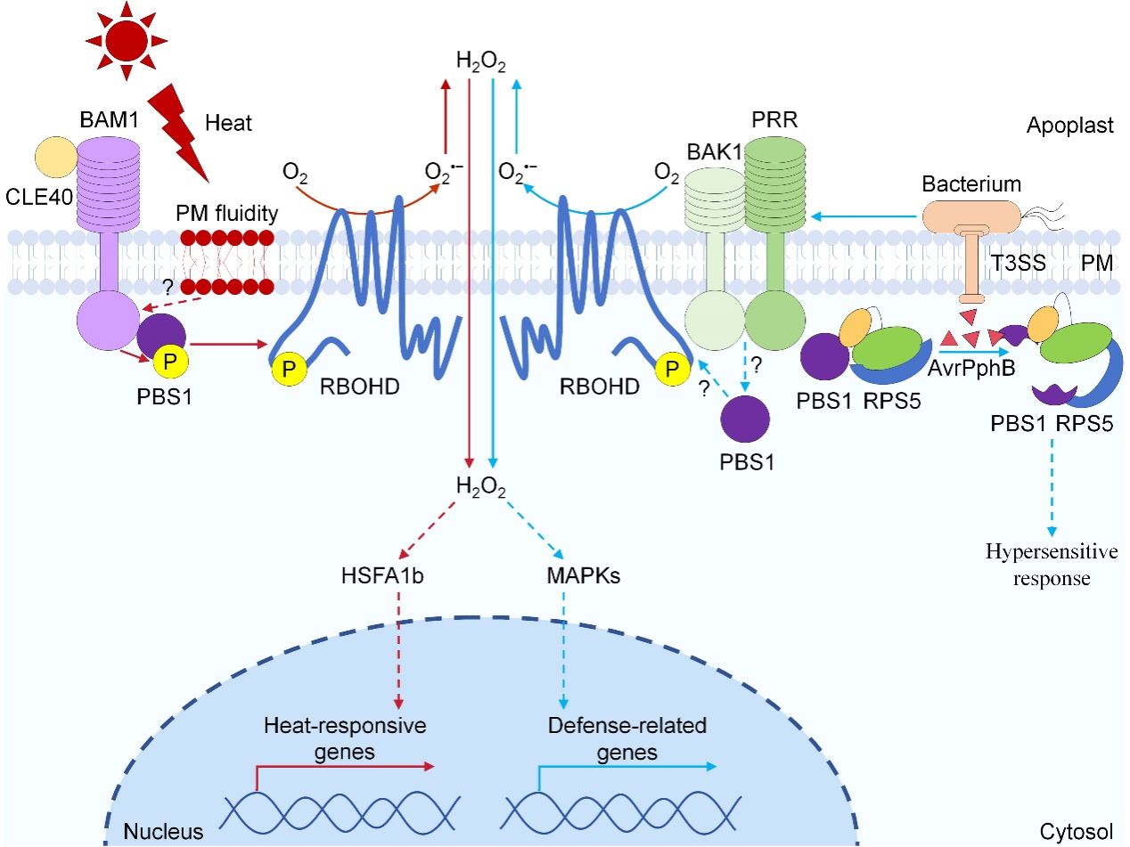 相关研究表明,质膜定位的类受体激酶BAM1与胞质激酶PBS1可在高温刺激后迅速形成信号模块,诱导活性氧信号产生,并进一步触发核内热响应相关基因的表达。该评论文章从信号整合的角度出发,总结并讨论了这一模块在植物早期热胁迫应答中的重要作用,为理解植物如何将环境温度变化快速转化为细胞内信号提供了新的思路。值得关注的是,PBS1此前已被广泛证明是植物免疫反应中的关键组分,在病原菌侵染过程中参与免疫激活。基于此,作者提出PBS1可能在不同生理情境下与不同受体或信号通路协同作用,在高温胁迫与免疫应答之间发挥信号整合和调控功能。这一观点为理解植物在复杂环境条件下维持免疫稳态提供了新的研究方向。