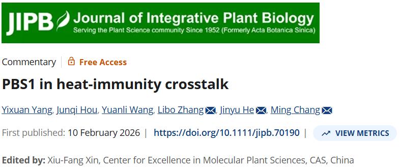 近日,南京农业大学生命科学学院常明教授团队联合贵州大学张利博教授团队,在植物科学专业期刊Journal of Integrative Plant Biology(JIPB)发表评论文章“PBS1 in Heat-Immunity Crosstalk”,围绕植物体内关键激酶PBS1在高温胁迫与免疫反应交叉调控中的潜在作用进行了系统讨论。该评论基于近期发表于Molecular Plant的研究成果 [2],对植物早期热信号转导机制及其与免疫信号网络之间的联系提出了新的理论模型。