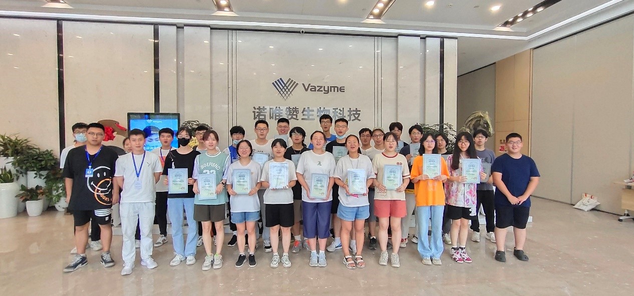 2022年7月9日,在菁英班班主任刘园园和“诺唯赞项目”专业指导教师谢彦杰的带领下,我院菁英班同学前往南京诺唯赞生物科技股份有限公司总部开展实践实习。从2017年我院与诺唯赞建立实践教学基地以来,“菁英班”每年前往诺唯赞总部实习,我院谢彦杰教授均全程陪同前往指导实习实践学习。